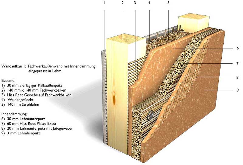 Bei der Innendämmung werden Schilfplatten bis zu 6 cm Stärke verwendet, die in Kombination mit Lehm verarbeitet werden. Durch den hohen Silikatgehalt nimmt Schilf nur geringe Mengen an Feuchtigkeit auf, so bleibt die Dämmwirkung dauerhaft erhalten. Lehm ist in der Lage, anfallende Feuchtigkeit aufgrund der hohe Hygroskopizität und guten Kapillarleitfähigkeit aufzunehmen und abzutransportieren. Hier zeigen wir Ihnen Wandaufbauten, Praxisbeispiele und eine Beschreibung wie eine Innendämmung mit Schilfrohrplatten durchgeführt wird.